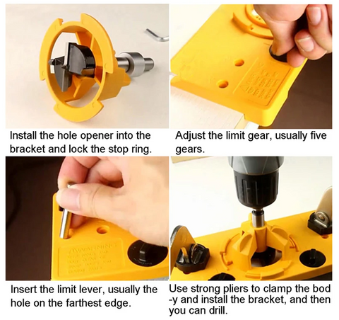 drill the pivot holes for the screws of the hinge which are 46mm, 47mm, 48mm or 52mm distance each other. And the hinge opening is suitable for 35mm hinges and also available with 26mm hinges.