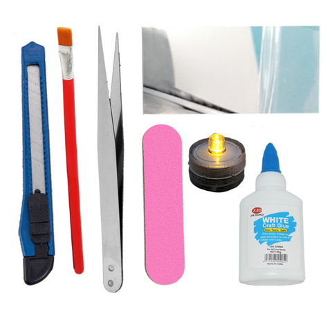 - Tool kit: Utility knife, brush, tweezers, Sanding Strip, mirror, lamp, glue. Free 10 PCs micro landscape accessories
