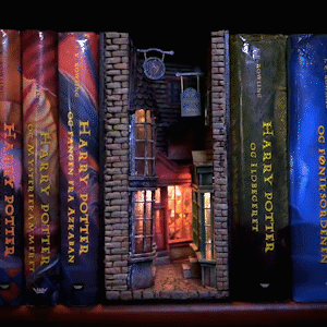 - Diagon alley bookshelf decoration is a Crafts,It is made up of many small materials, which has ornamental value and is very collectible. It will be a good choice for home decoration, bookshelf decoration, cabinet decoration.